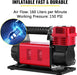 The pure copper motor has sufficient power to allow the air inflator to inflate tyres in minutes. Maximum working pressure 150 PSI air flow 160 litres per minute