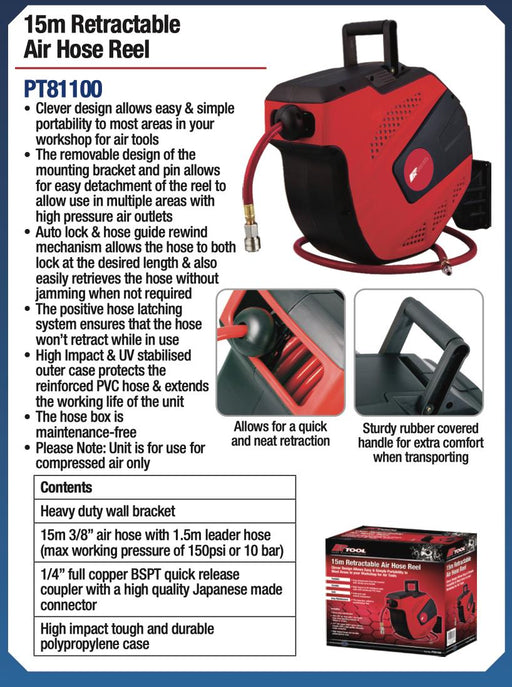 FISHER DISCOUNT15m Retractable Air Hoes Reel Item Number PT81100 Contents:Heavy duty all bracket 15m 3/8" air hose with 1.5m leader hose (max working pressure...
