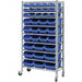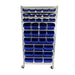 Silver powder coated steel construction with zinc plated wire shelving and tub locating guides. Easy to assemble boltless frame with ten tiers. 36 Durable blue plastic bins with space for label.