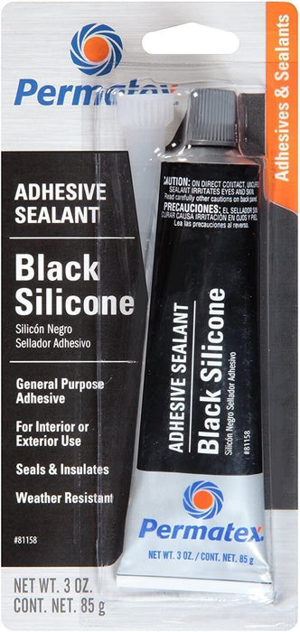 Permatex Black Silicone Adhesive Sealant is a general-purpose, black RTV indoor/outdoor sealant. Effectively bonds, repairs, seals, mends and secures glass, metal, plastics, fabric, vinyl, weather stripping and vinyl tops. Also protects and repairs electrical wiring and may be applied to horizontal or vertical surfaces. Waterproof and flexible with a temperature range of -75 degrees Fahrenheit to 450 degrees Fahrenheit, this sealant is oil, water, weather, vibration and grease resistant. Suggested applications include windshields, door frames, electrical connections, seams and roofs, vinyl tops, and weather stripping.